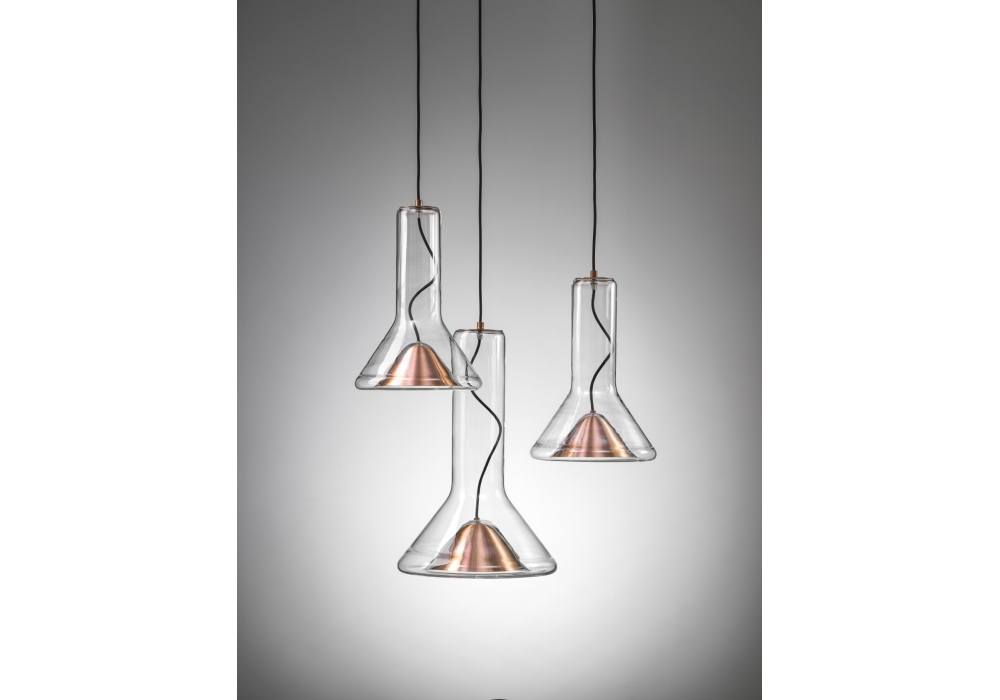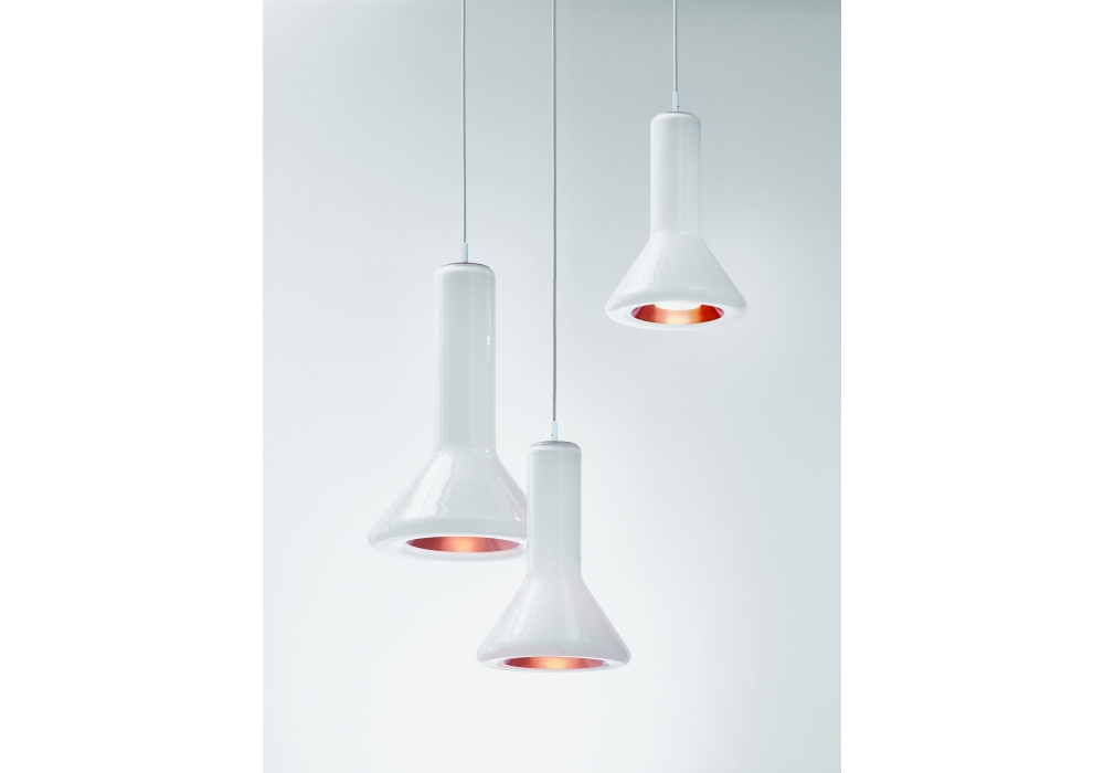 Whistle Set conçue par Lucie Koldová pour Brokis est une suspension avec auvent triangulaire en métal enduit de poudre. Les diffuseurs sont en verre soufflé et abritent une source lumineuse à LED dimmable, alimentée par un câble recouvert de fibre textile. Whistle Set est disponible en différentes finitions.