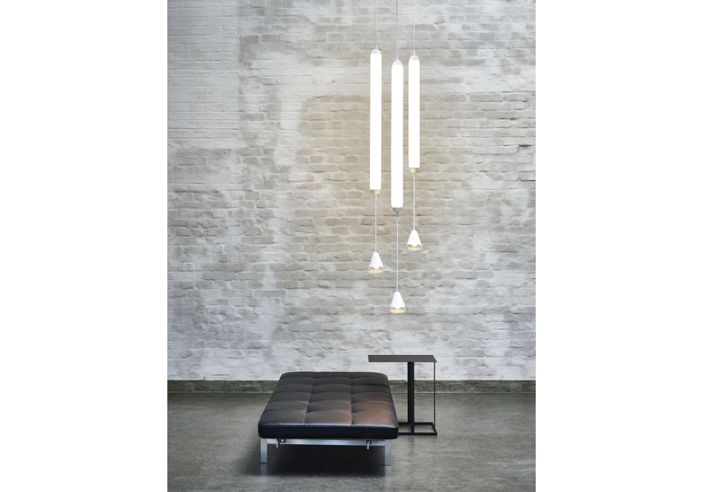 Puro Single Vertical conçue par Lucie Koldova pour Brokis est une suspension à structure cylindrique en verre et métal thermolaqué. L'abat-jour est en verre soufflé avec une surface opaque et gravée à l'acide. Le diffuseur, en métal moulé sous pression, utilise une source lumineuse LED à intensité variable disponible en différentes versions. Un spot est intégré dans la partie inférieure.