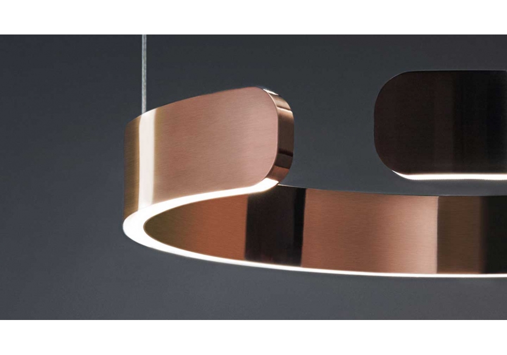 Mito Sospeso 40 conçu par Occhio est une suspension à LED réglable en hauteur, grâce au système révolutionnaire de gestion des gestes "touchless control", il est possible de calibrer en continu la couleur de la lumière. Il est composé d'aluminium, d'acier peint, d'un revêtement PVD, de plastique, de silicone optique et de fibre de verre.