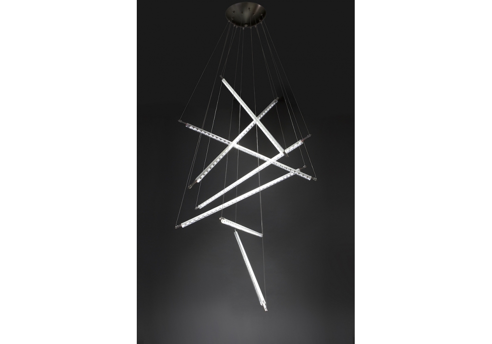 Ixion Quasar conçue par Jos Muller pour Quasar est une lampe à suspension avec rosace métallique linéaire ou circulaire. Le diffuseur est en verre cylindrique, la moitié en ligne horizontale, dépoli pour diffuser une lumière douce et subtile, l'autre moitié transparente pour diffuser une lumière incisive et directe. La source lumineuse adoptée est un type LED dimmable. Ixion est disponible en quatre modèles différents, avec un seul diffuseur la rosace est linéaire, avec plusieurs diffuseurs la rosace est circulaire.
