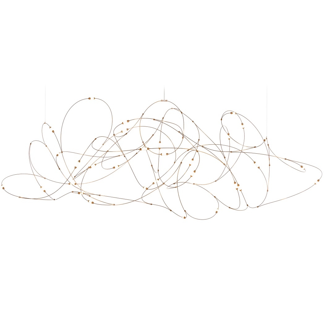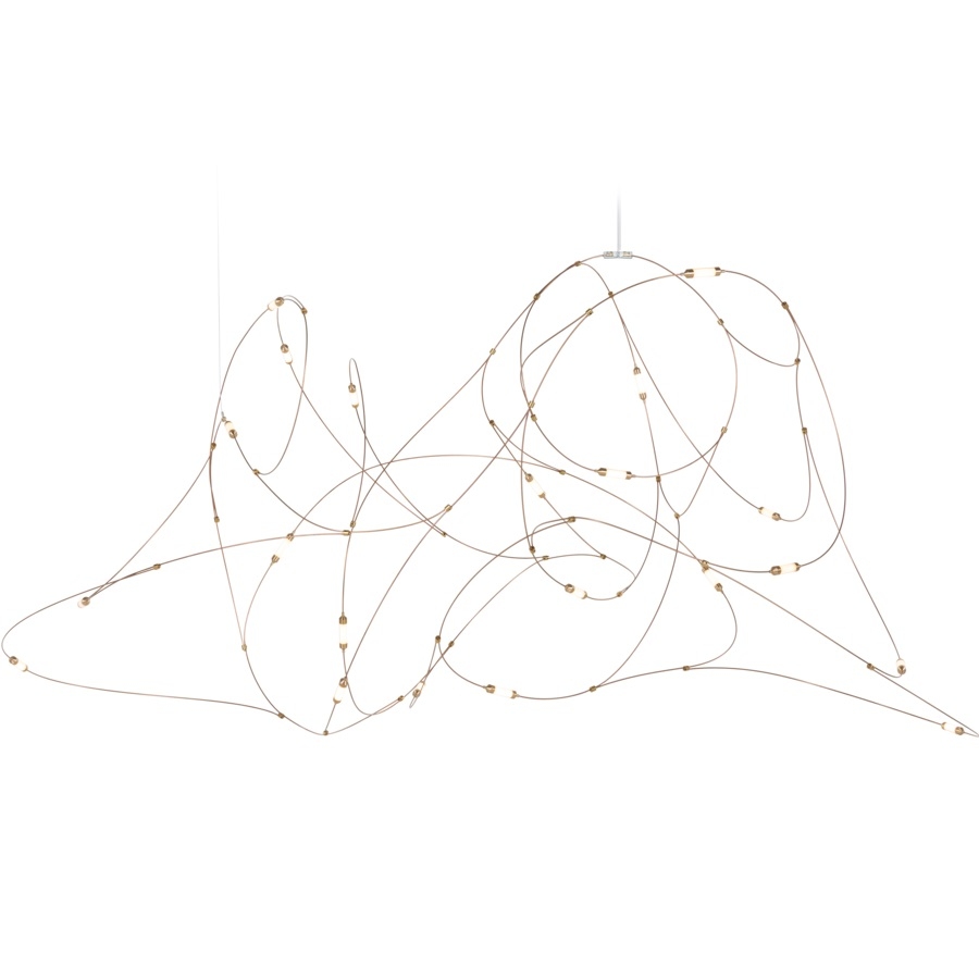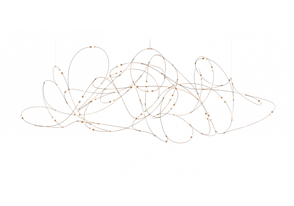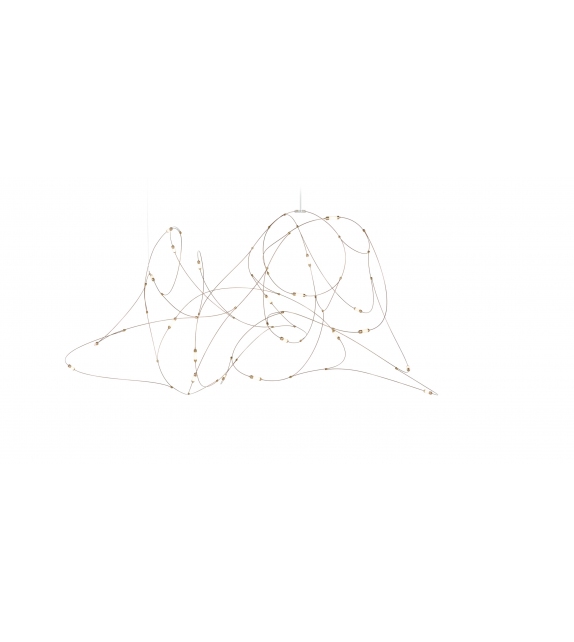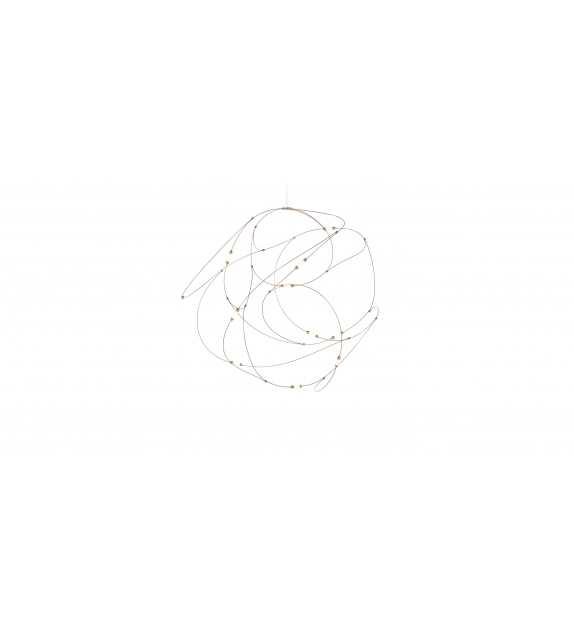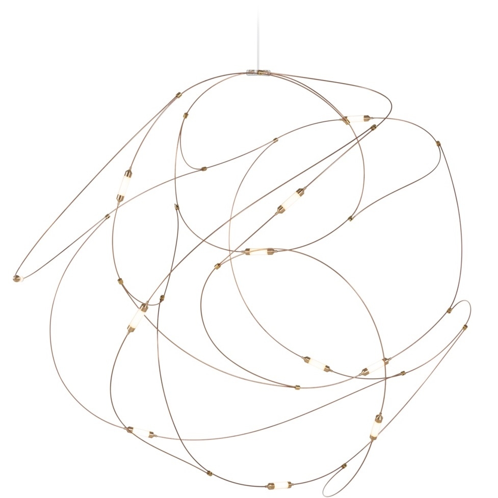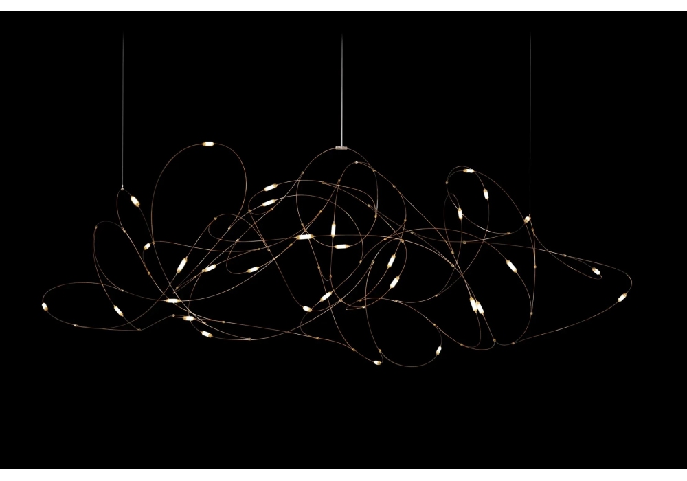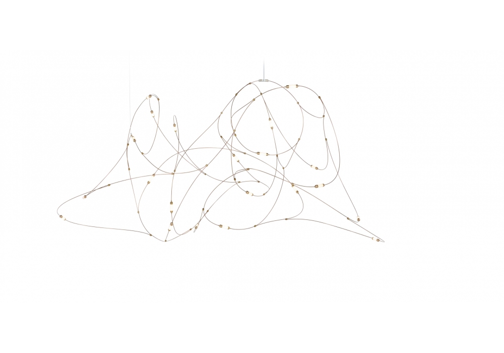 Flock of Light conçue par Studio Toer pour Moooi est une lampe à suspension avec fils de bronze, coupelles en laiton avec diffuseurs en polycarbonate semi-transparent. Disponible en trois configurations.