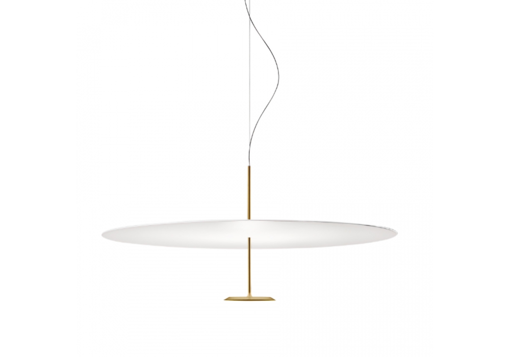 Dot conçue par Foster + Partner pour Lumina est une lampe à suspension structurée par deux disques parallèles maintenus ensemble par une tige en métal anodisé noir ou laiton anodisé. La source lumineuse est du type LED à intensité variable intégrée. Dot est disponible en deux tailles différentes avec disque Ø 110 cm ou Ø 80 cm.