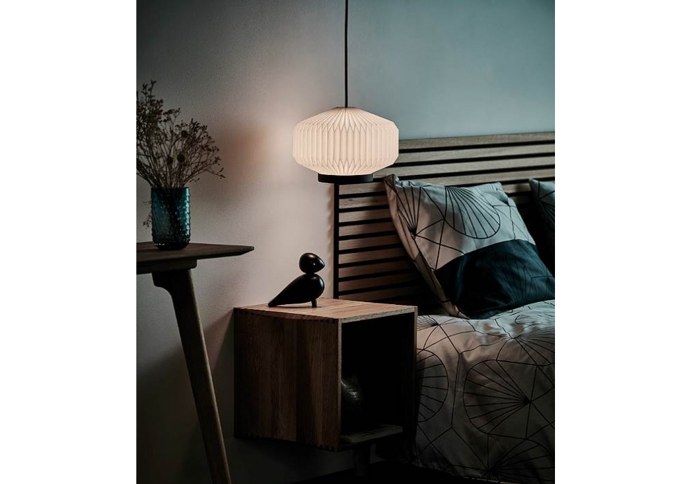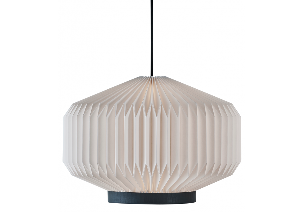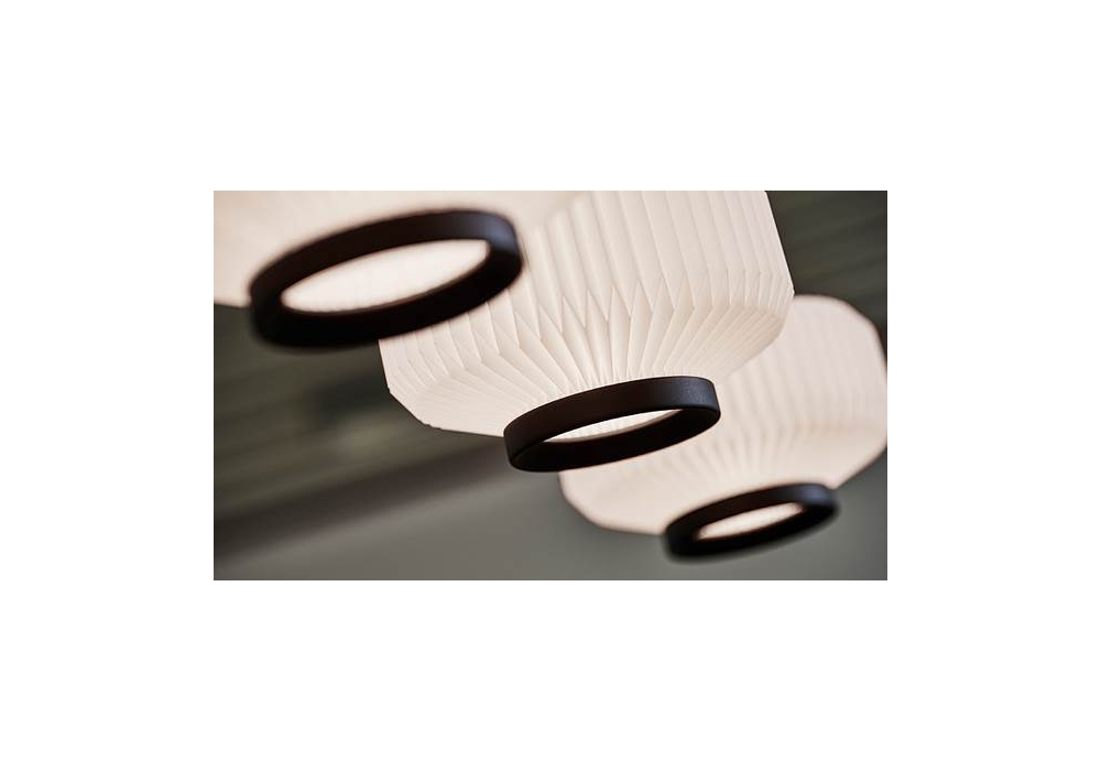 Shibui conçue par Søren Refsgaard pour Le Klint est une lampe à suspension structurée par la combinaison du métal et du papier. L'abat-jour est en papier ondulé, adopte une source lumineuse LED ou halogène (non incluse) alimentée par un câble en fibre textile noire. Shibui est disponible en trois tailles différentes.
