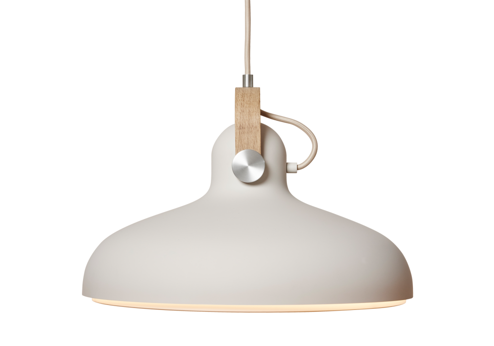 Carronade conçue par Markus Johansson pour Le Klint est une lampe à suspension structurée par la combinaison du métal et du bois. L'abat-jour est en aluminium circulaire soutenu par un bracelet en chêne ou en noyer américain avec des détails et des vis de support en laiton ou en aluminium. La source lumineuse utilisée est à LED ou halogène (non fournie) alimentée par un câble en fibre textile de la même couleur que l'abat-jour. Carronade est disponible en deux finitions différentes.