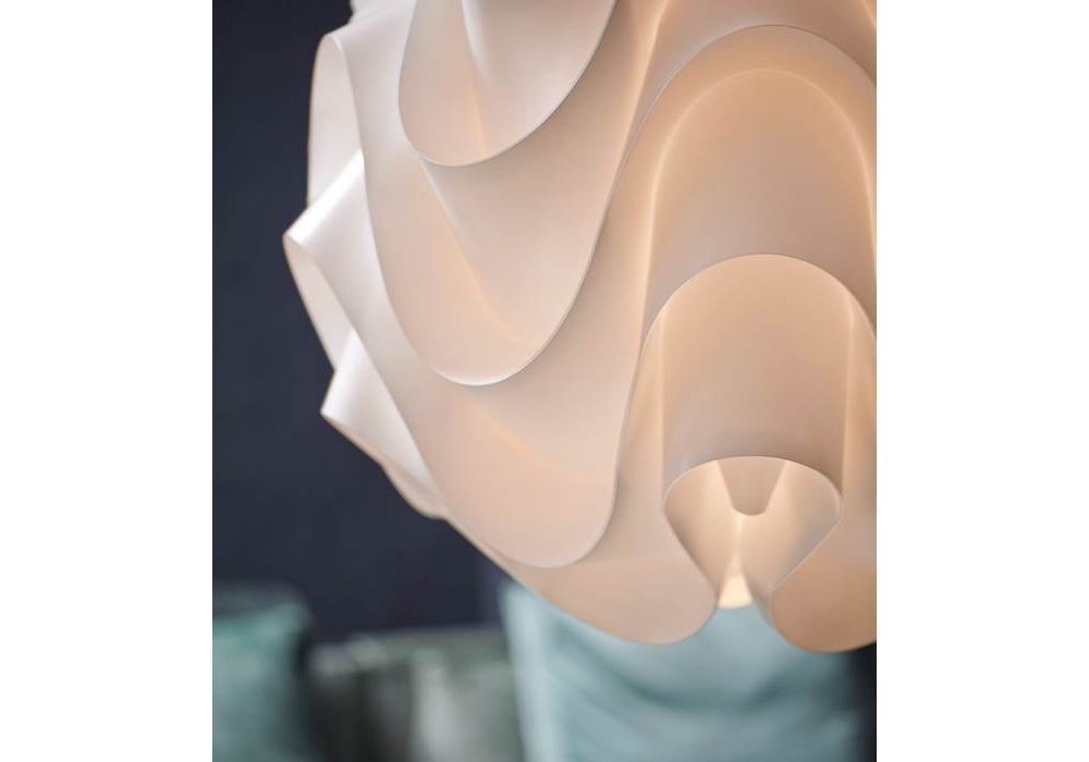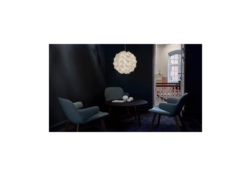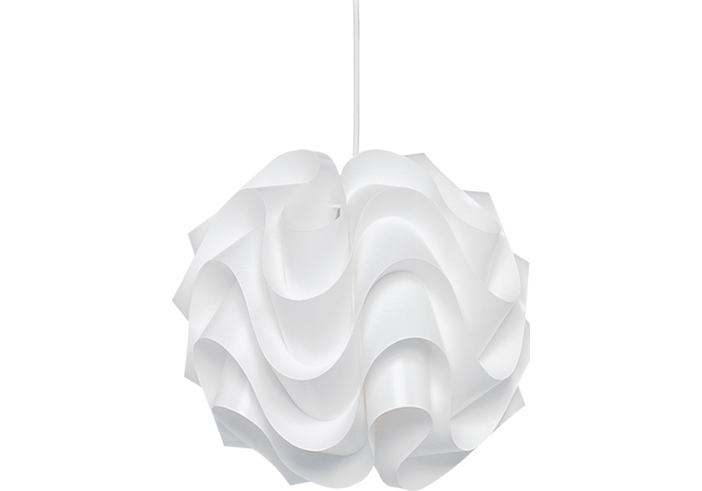 172 conçue par Poul Christiansen pour Le Klint est une lampe à suspension entièrement structurée en matière plastique. L'abat-jour est de forme sphérique tandis que la surface est enrichie de plis qui simulent un mouvement ondulatoire. La source lumineuse utilisée est à LED ou halogène (non fournie) alimentée par un câble recouvert de matière plastique blanche. 172 est disponible en différentes tailles.