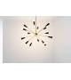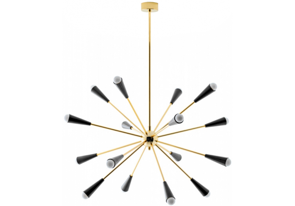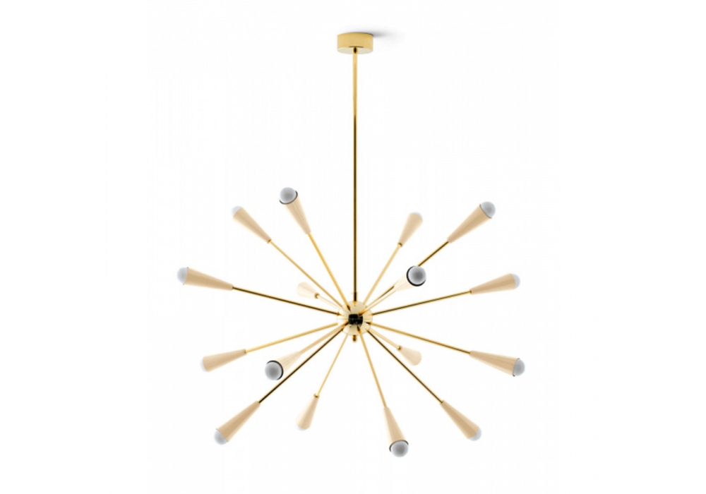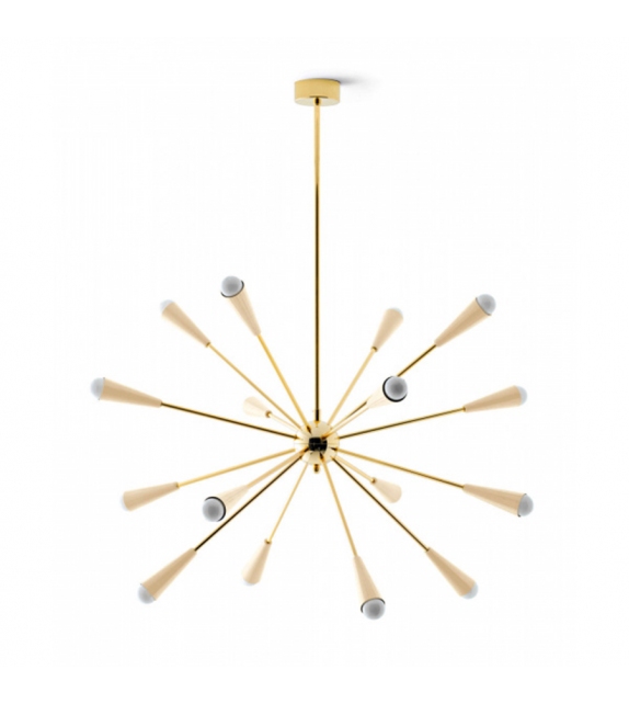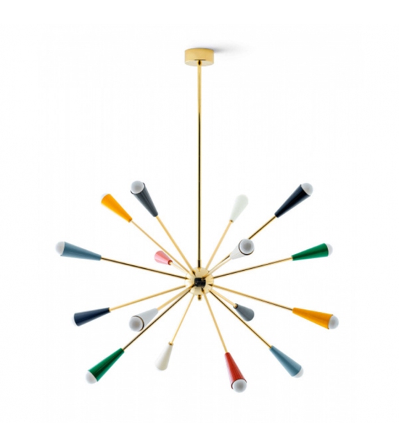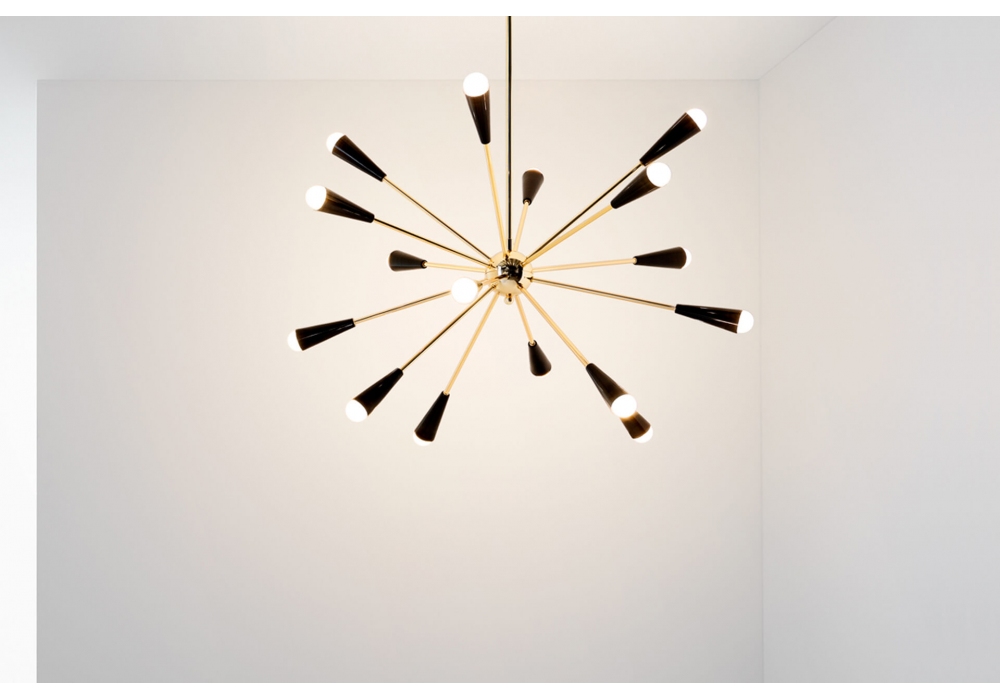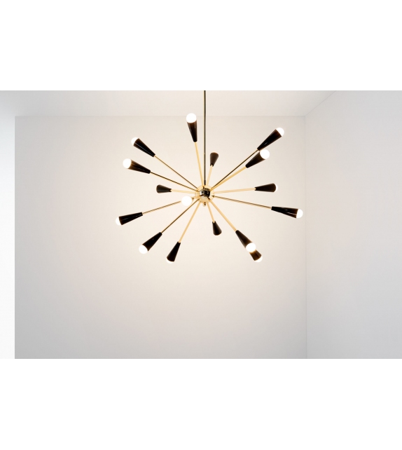 Sputnik conçue et produite par Stilnovo est une lampe à suspension entièrement en laiton. Le corps de la lampe est composé de plusieurs tiges tubulaires ancrées à un noyau central. Les diffuseurs coniques sont peints en trois finitions différentes : or-noir, or-ivoire et or-multicolore et adoptent une source de lumière LED.
