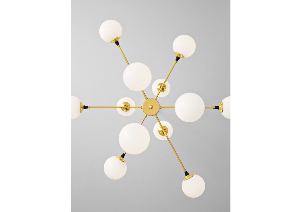 Galassia conçue et produite par Stilnovo est une lampe à suspension LED avec structure portante en laiton tubulaire traité par un procédé galvanique. Les diffuseurs sont sphériques en verre triplex blanc. Galaxy est disponible en deux tailles différentes.