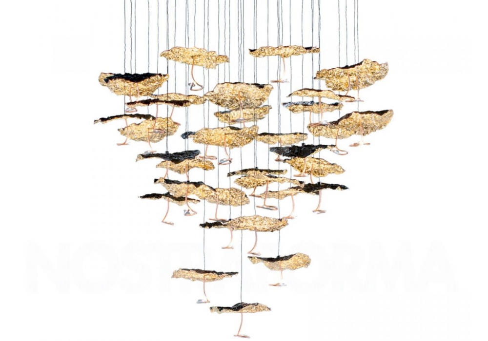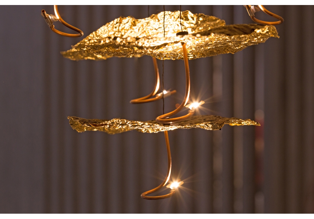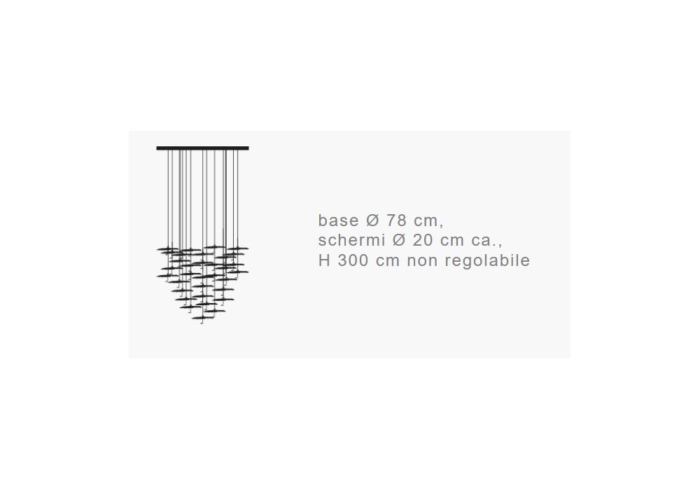 Gold Moon Chandelier conçue par da Enzo Catellani pour Catellani & Smith est une lampe à suspension avec base en acier satiné, écrans avec finition noire / feuille d'or, boucles en cuivre et prise en nickel. Les câbles de suspension sont noirs. La lampe est disponible avec 20, 25 ou 35 LED.