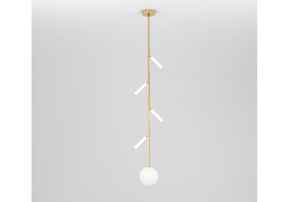 Arrow conçue par Atelier Areti est une lampe à suspension en laiton brossé ou nickel et diffuseurs en verre blanc. Disponible en différents modèles.