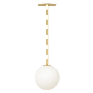Linetype Globe conçue par Atelier Areti est une lampe à suspension en laiton brossé, panneaux en acrylique blanc et diffuseur en verre blanc. Disponible en différents modèles.