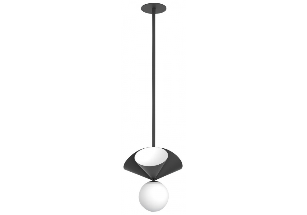 Globe with three Cones conçue par Atelier Areti est une lampe à suspension caractérisée par un tube et une fixation disponible en laiton brossé ou peint en noir. Cônes noirs avec réflecteur blanc.