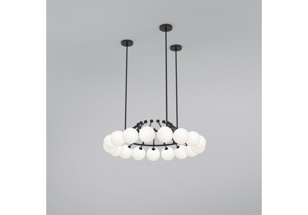 Lever Rounded conçu par Atelier Areti est un lustre à suspension en laiton brossé ou en métal peint en différentes finitions. Diffuseurs en verre blanc.