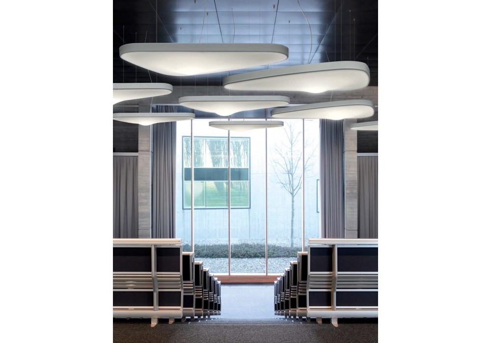 Pétale conçue par Studio Odile Decq pour Luceplan est une suspension réalisée à partir d'un panneau insonorisant recouvert de tissu blanc. Il est possible de choisir le type d'optique et de source lumineuse. Disponible en différents modèles.