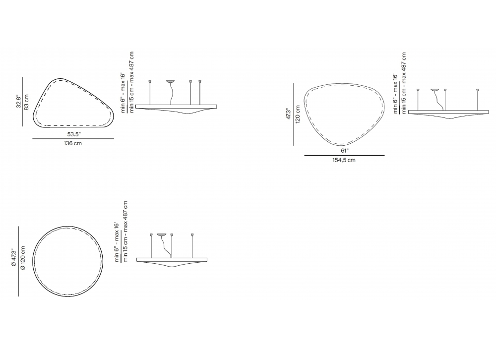 | Dimensions | - 136 x 83 x H 6 cm; - Ø 120 x H 7 cm; - 15.5 x 120 x H 6 cm. |