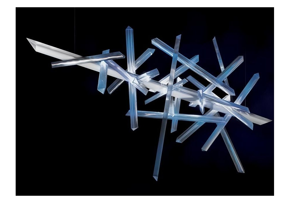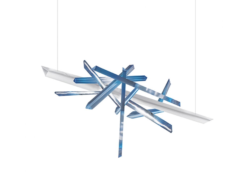 La Traviata conçue par Robert Wilson pour Slamp est une lampe à suspension structurée par plusieurs éléments entrecroisés entièrement réalisés en Lentiflex® et méthacrylate. Les sources lumineuses adoptées sont des LED RVB dimmables. La Traviata est disponible en différentes tailles.