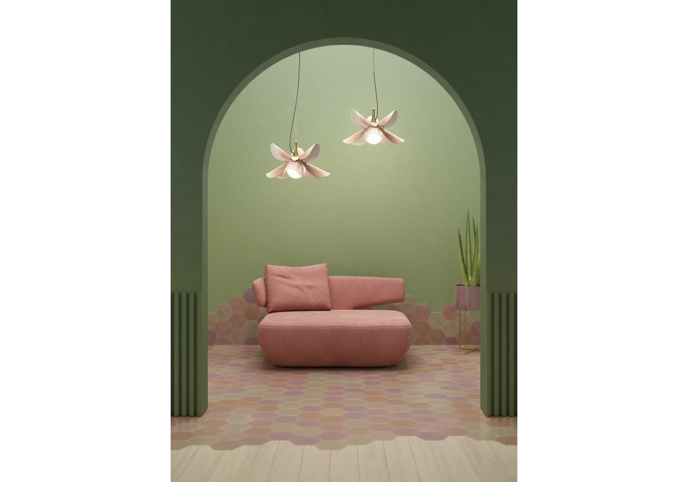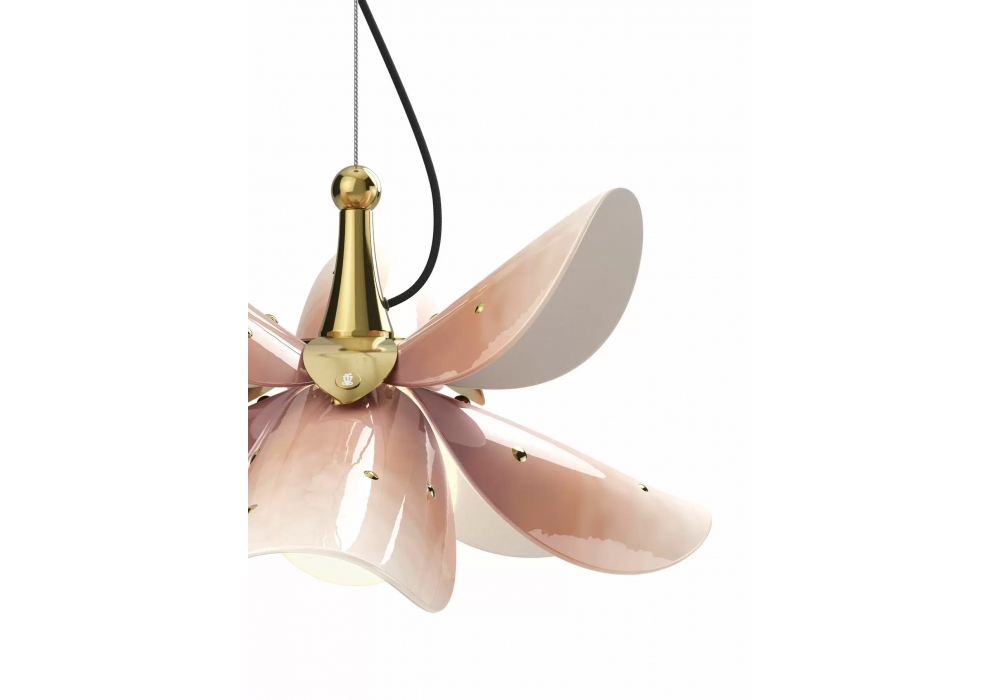 Blossom conçue par Dept. Diseño y Decoración pour Lladró est une lampe à suspension réalisée à partir de la combinaison de porcelaine et de métal doré. Le diffuseur est composé d'un ensemble de pétales en porcelaine faits à la main. Blossom est disponible en différentes finitions.