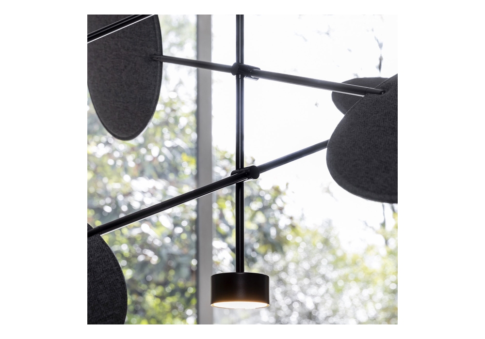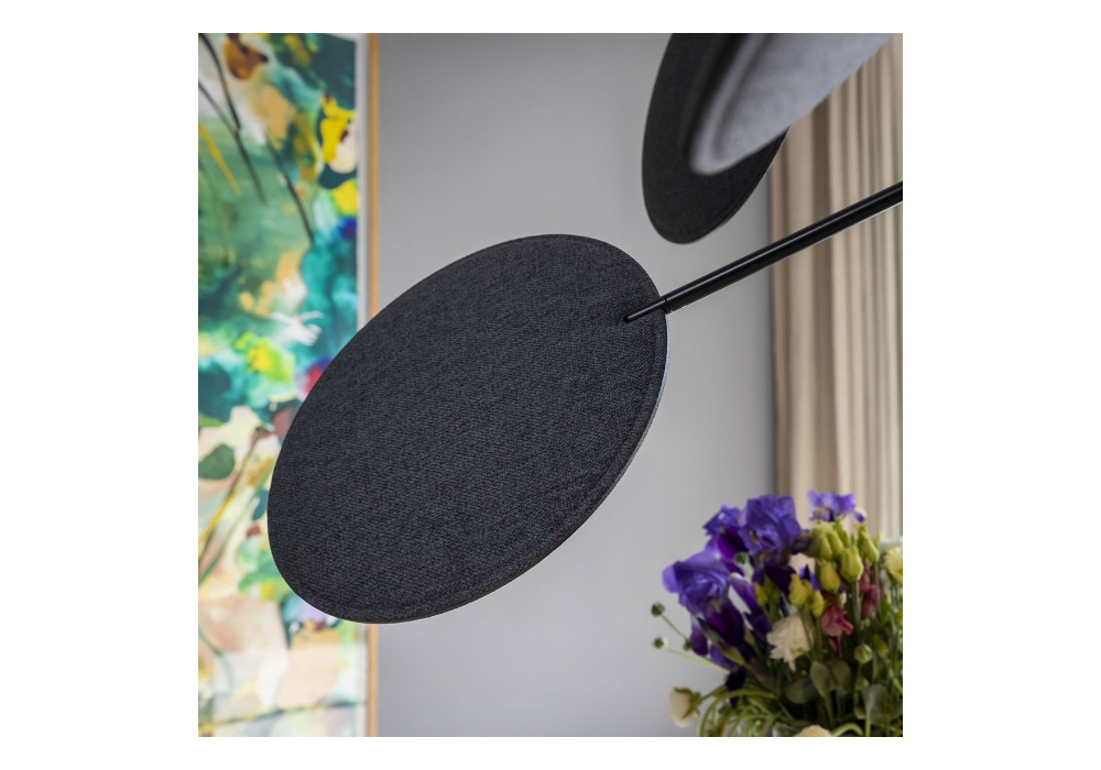 Diva conçue par Sebastiano Tosi pour Mogg est une suspension réalisée avec une structure en métal avec des bras porte-disques réglables. Disques réglables aux propriétés insonorisantes recouverts de tissu. Disponible en différentes finitions et dimensions.