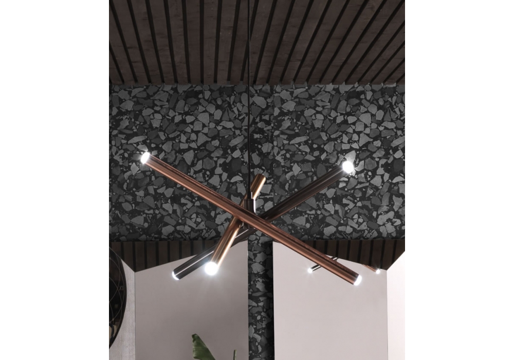 Shangai S6 conçue par Riflessi est une suspension composée de trois tubes métalliques peints avec un traitement galvanique satiné. La lampe se compose de six lumières LED directionnelles fixes. Câble électrique en tissu noir réglable en hauteur max. 120cm.