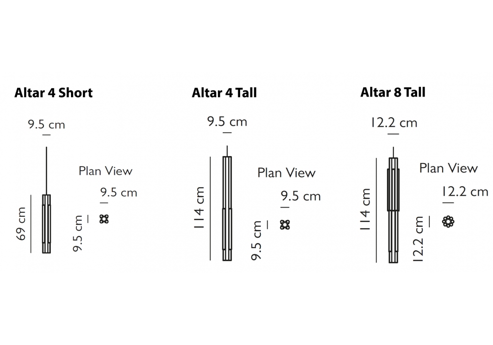 | Dimensions | 9,5 x 9,5 x H 69 cm; 9,5 x 9,5 x H 114 cm; 12,2 x 12,2 x H 114 cm. |
