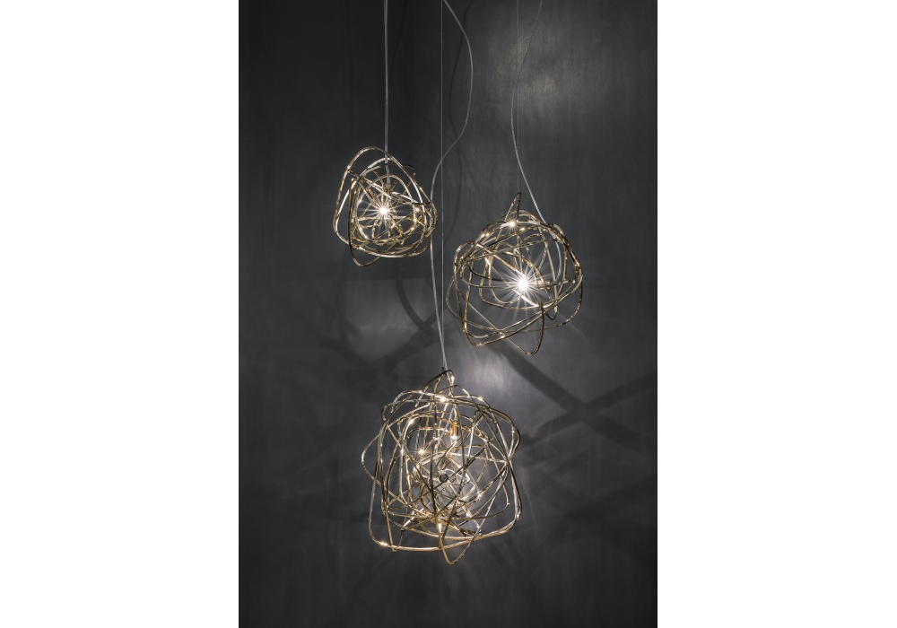 Doodle Small conçue par Simone Micheli pour Terzani est une lampe à suspension entièrement structurée en métal tressé. La source lumineuse utilisée est la LED en version dimmable ou non dimmable. Doodle Small est disponible en différentes finitions.