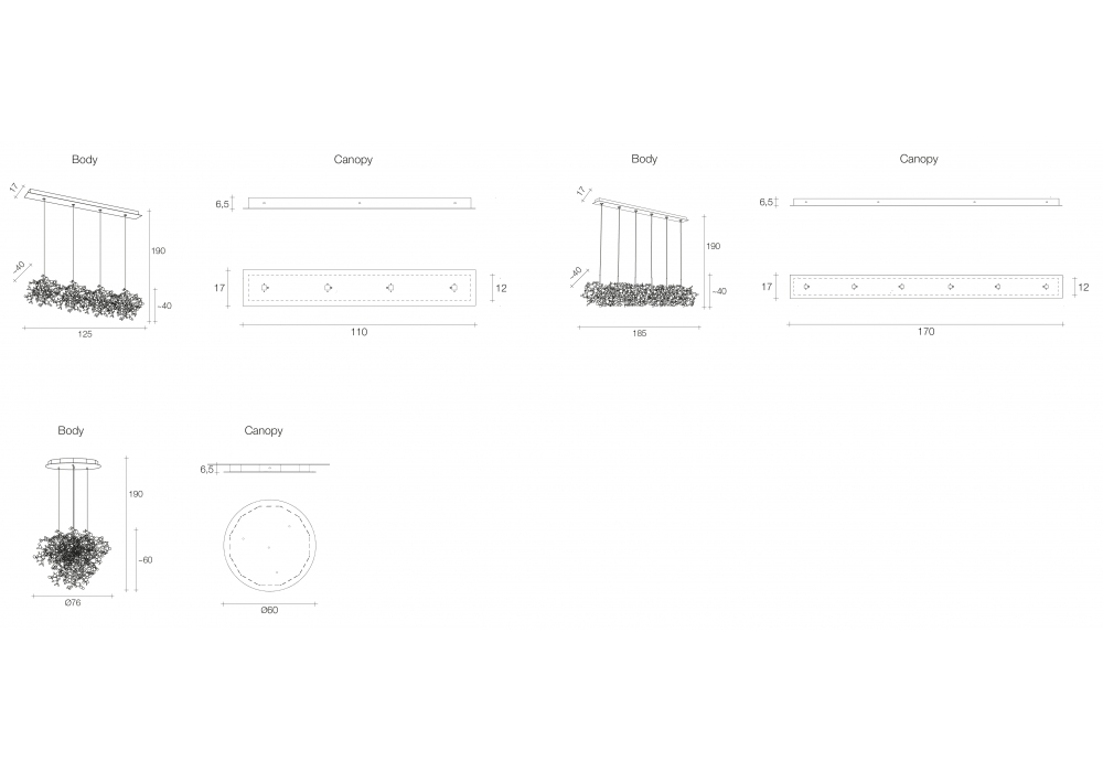 | Plafond rose | Ø 60 x H 6,5 cm (Round); 125 x 17 x H 6,5 cm (Linear 4); 170 x 17 x H 6,5 cm (Linear 4). |