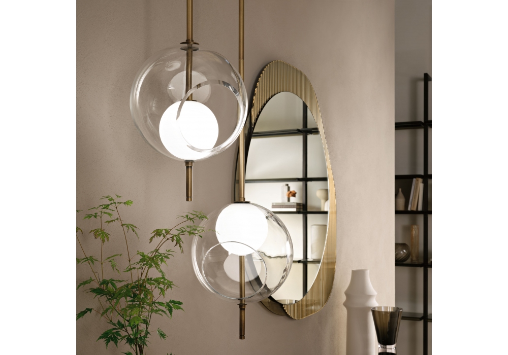 Pearl conçue par Adele Martelli pour Fiam est une lampe à suspension LED avec structure en métal finition laiton bruni. La sphère externe est en verre soufflé de Murano transparent, tandis que la sphère interne, qui fait office de diffuseur, est en verre soufflé blanc opale.
