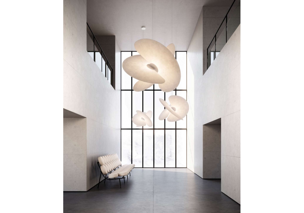 Levante conçue par Marco Spatti pour Luceplan est une suspension avec structure en aluminium blanc mat et diffuseur en PET. Disponible en deux dimensions.