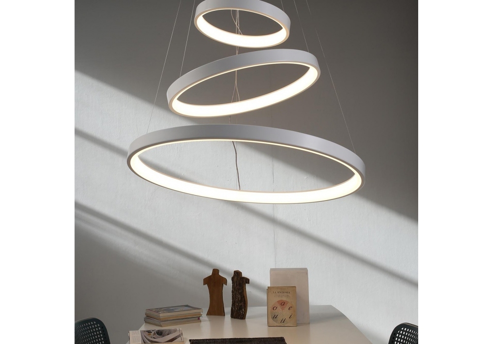Lunaop Multi conçue par Emiliana Martinelli pour Martinelli Luce est une lampe à suspension de forme circulaire avec structure en aluminium peint. Les diffuseurs sont en méthacrylate blanc et adoptent une source lumineuse LED dimmable ou non dimmable intégrée dans différentes nuances de lumière. Lunaop Multi est disponible en différents modèles, versions et finitions.