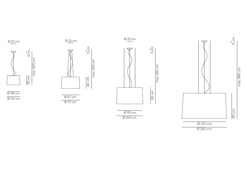 | Dimensions | • Ø 46/50 x H 35 cm - Hmax 325 cm; • Ø 67/70 x H 44 cm - Hmax 330 cm; • Ø 95/100 x H 63 cm - Hmax 350 cm; • Ø 150/160 x H 90 cm - Hmax 380 cm |