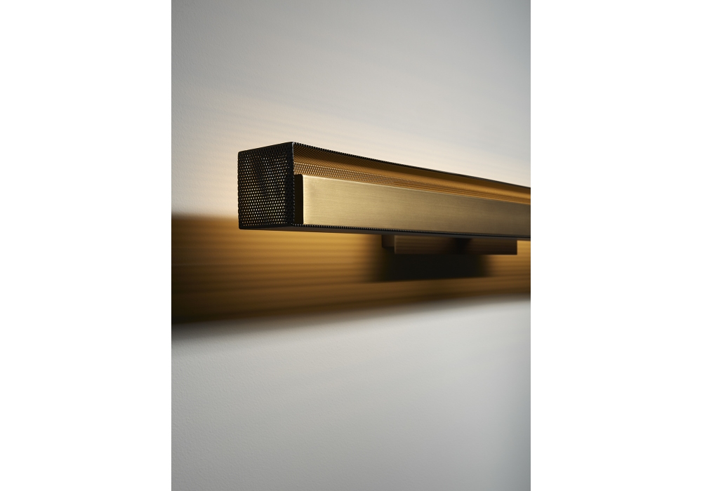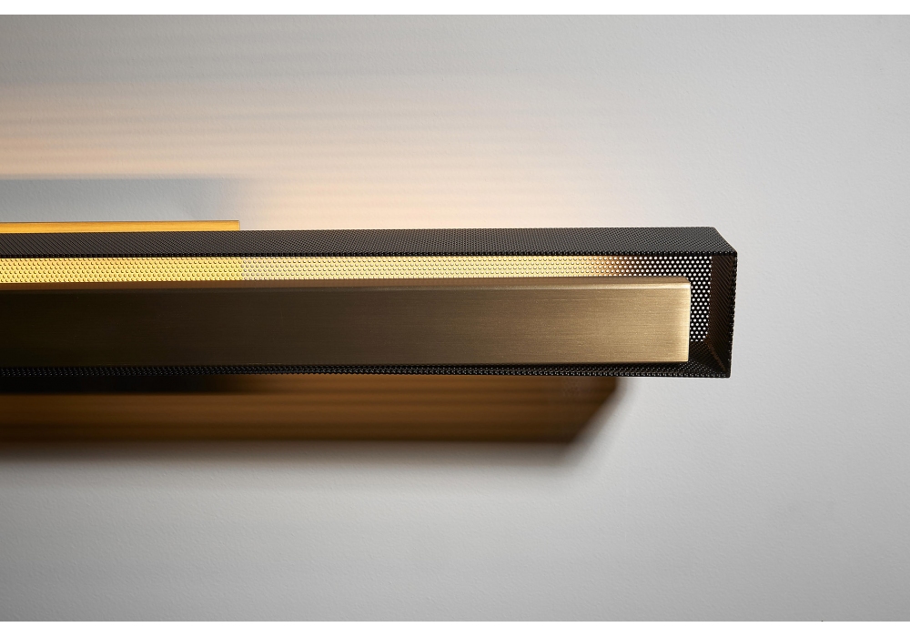 Urban Lightline conçue par Massimo Tonetto pour Venicem est une applique à lumière indirecte. Structure en laiton bruni clair et abat-jour en métal perforé noir mat. Kit variateur vendu séparément.