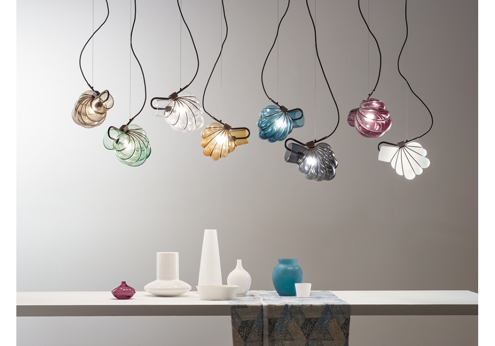 Dedicato conçue par Domenico Rinaldi pour Fisionarte est une lampe à suspension avec structure en acier brut et cadre peint en noir mat. Le diffuseur a une forme arrondie en verre de Murano et abrite une source lumineuse avec insert E27 ou E14 alimentée par un câble en fibre textile noire. Dedicato est disponible en différents modèles et finitions.