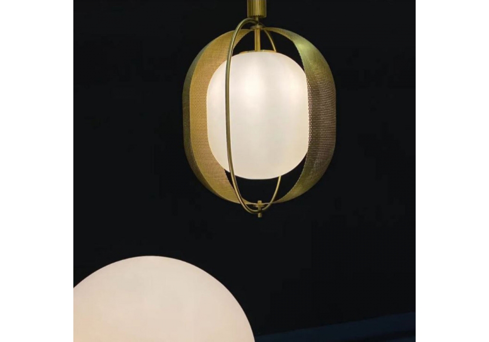 Pearl conçue par Kristian Sofus Hansen & Tommy Hyldahl pour 101 Copenhagen est une lampe à suspension en métal plaqué laiton et diffuseur en verre opale.