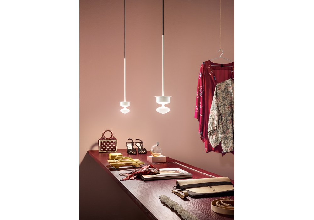 Desideria Small conçue par Domenico Rinaldi pour Fisionarte est une lampe à suspension avec structure en métal en différentes finitions. Le diffuseur est en verre borosilicaté avec une finition opaque ou transparente et protège une source lumineuse LED dimmable.