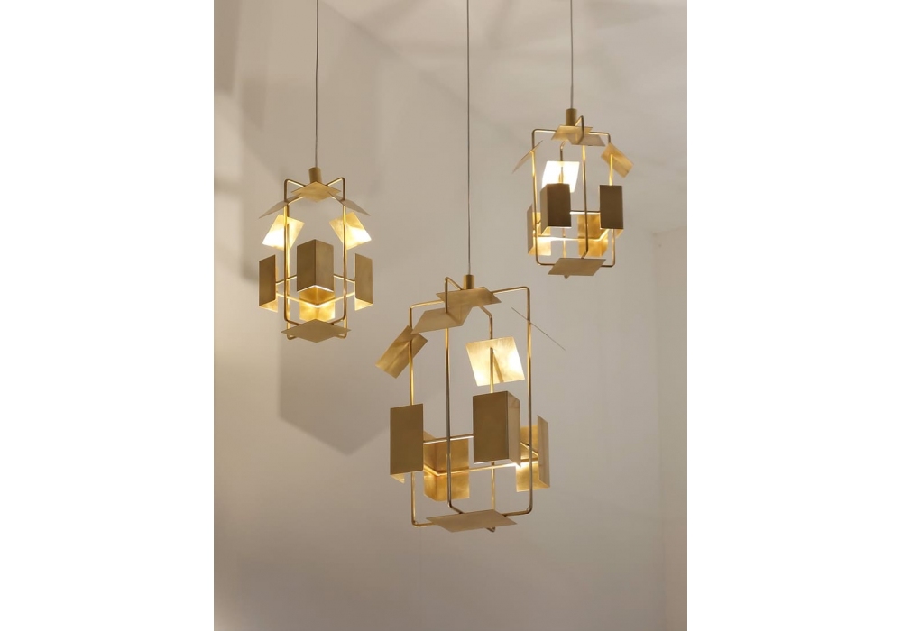 Lampion S conçue par Ombre Portée est une suspension réalisée en laiton brossé et ciré. Pavillon en acier peint.