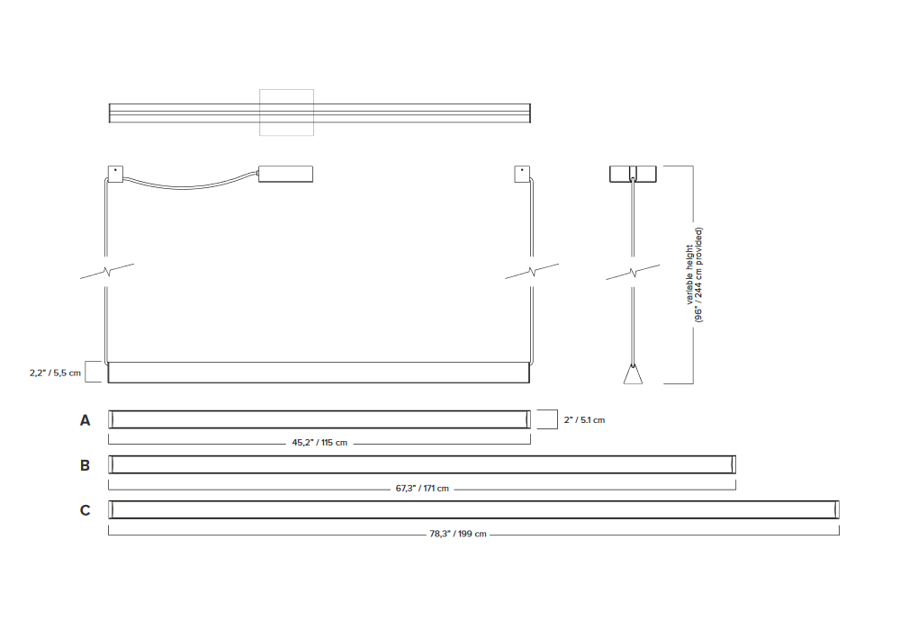 | Dimensions | Model A: 115 x 6 x 8.9 cm; Model B: 172 x 6 x 8.9 cm; Model C: 201 x 6 x 8.9 cm. |