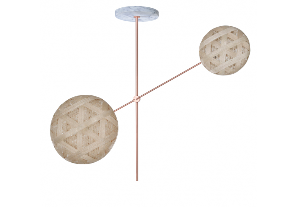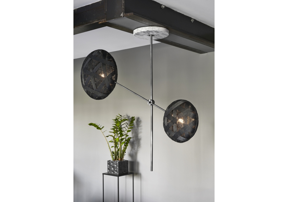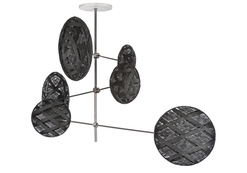 Chanpen Plusieurs conçue par Anon Pairot pour Forestier est une suspension en métal recouvert d'une corde d'abaca. La version 2 lumières se compose de deux diffuseurs noirs Ø 19 et Ø 52 cm et structure en finition Gun Metal, la version 6 lumières comprend 1 diffuseur Ø 19 cm, 2 diffuseurs Ø 26 cm et trois Ø 52 cm en finition blanche et structure Gun Metal.
