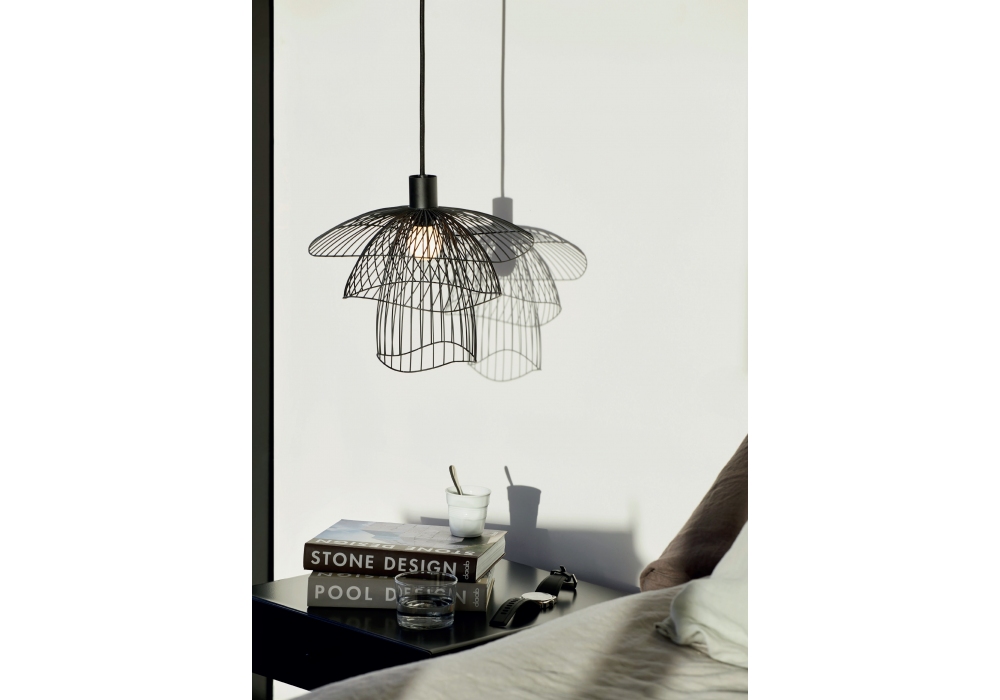 Papillon conçue par Élise Fouin pour Forestier est une suspension composée de trois structures métalliques superposées. Les fils métalliques de chaque cadre sont dédoublés et torsadés pour obtenir cet effet graphique. Disponible en différentes dimensions et finitions.