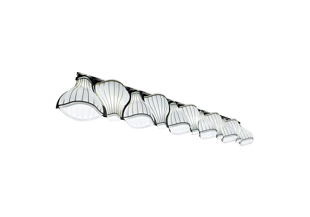 Rhythm conçue par I M LAB pour Venini est une lampe à suspension avec 11 éléments en verre soufflé travaillé, à l'intérieur d'une structure en métal nickel noir, qui fait partie de l'objet lui-même.