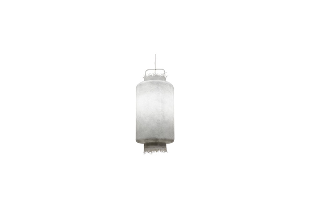 Kimono conçue par Matteo Ugolini pour Karman est une lampe à suspension avec rosace en métal blanc mat et structure en fibre de verre blanche. Disponible en différentes tailles.