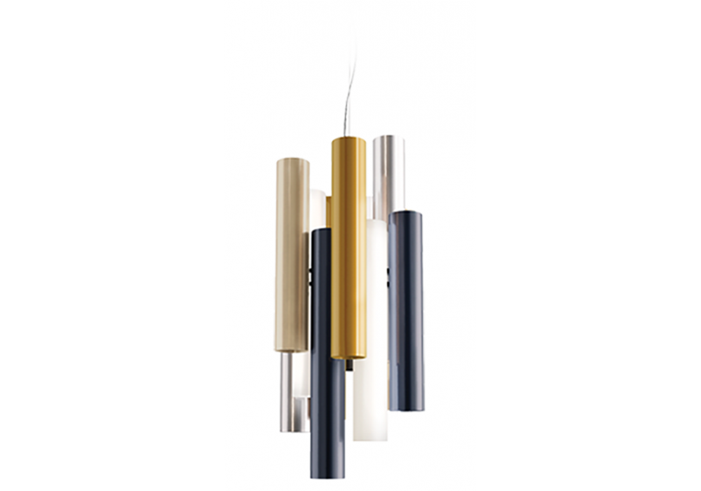 Toot conçue par Karim Rashid pour Kundalini est une suspension dimmable avec diffuseurs en plexiglas coloré ou satiné et structure en métal peint.