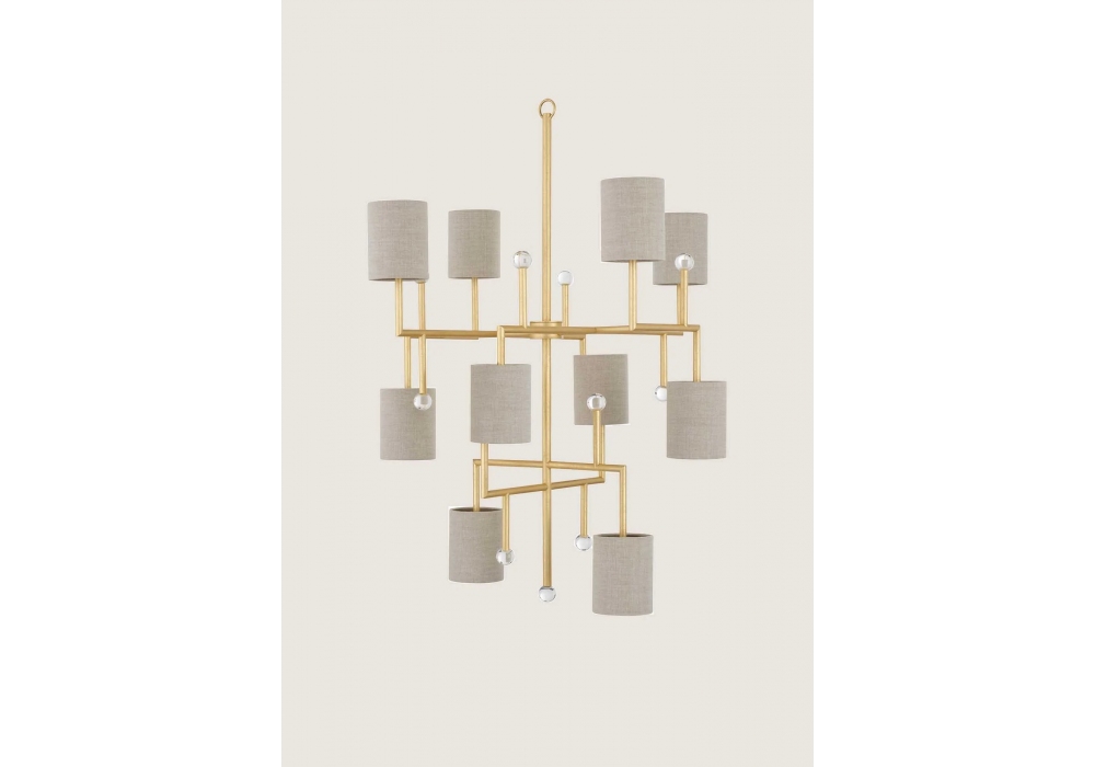 Quantum produit et conçu par Porta Romana est un lustre avec une structure portante en acier tubulaire peint et des décorations en sphères de verre moulé. Les abat-jour sont cylindriques en tissu et masquent une source lumineuse avec une douille E14 de type LED. Quantum est disponible en différentes finitions.