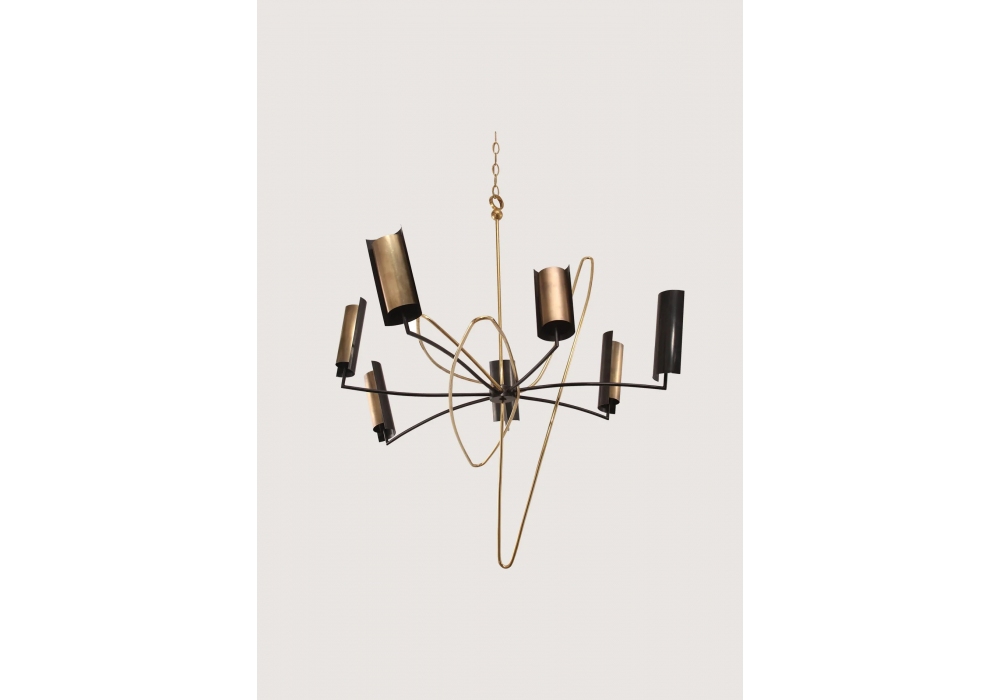Sputnik produit et signé par Porta Romana est un lustre avec une structure portante en métal peint en bronze et laiton. Les abat-jours sont cylindriques en métal et abritent une source lumineuse avec une connexion LED de type G9.