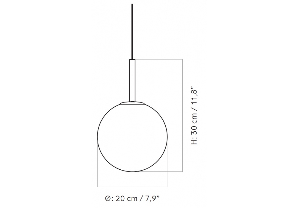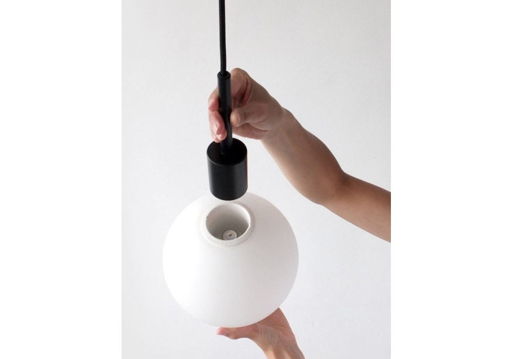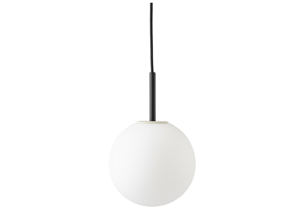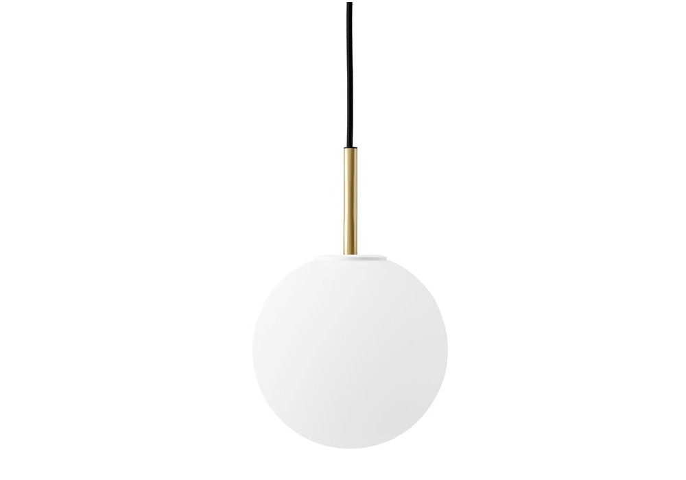 TR conçue par Tim Rundle pour Audo Copenhagen est une lampe à suspension avec pendentif en acier peint noir ou laiton brossé et diffuseur en verre opaque.