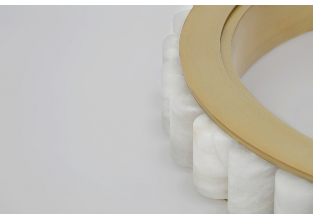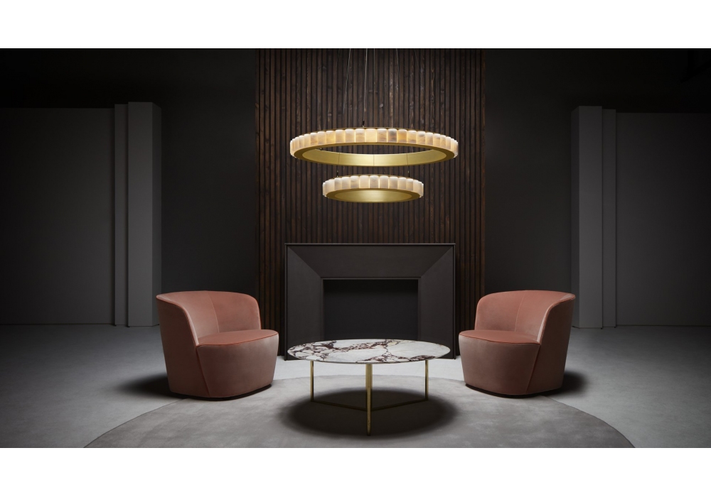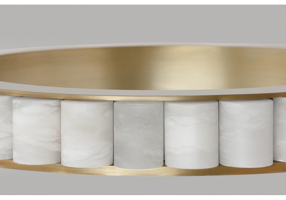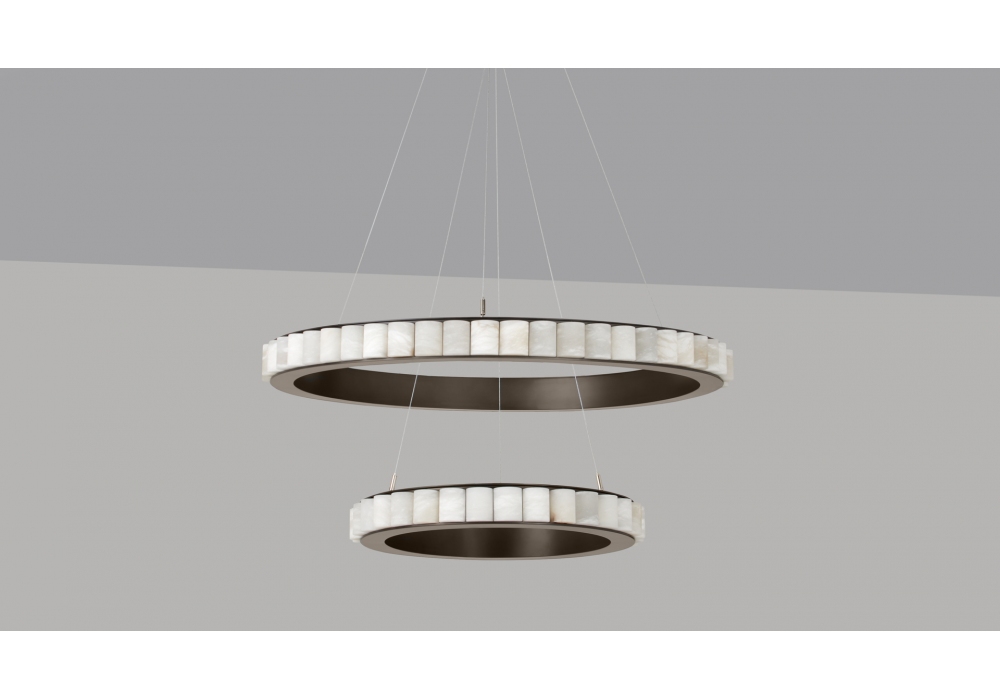 Avalon Halo conçue par CTO Lighting est une suspension LED en bronze ou laiton satiné, détails en albâtre. Câble en acier inoxydable.