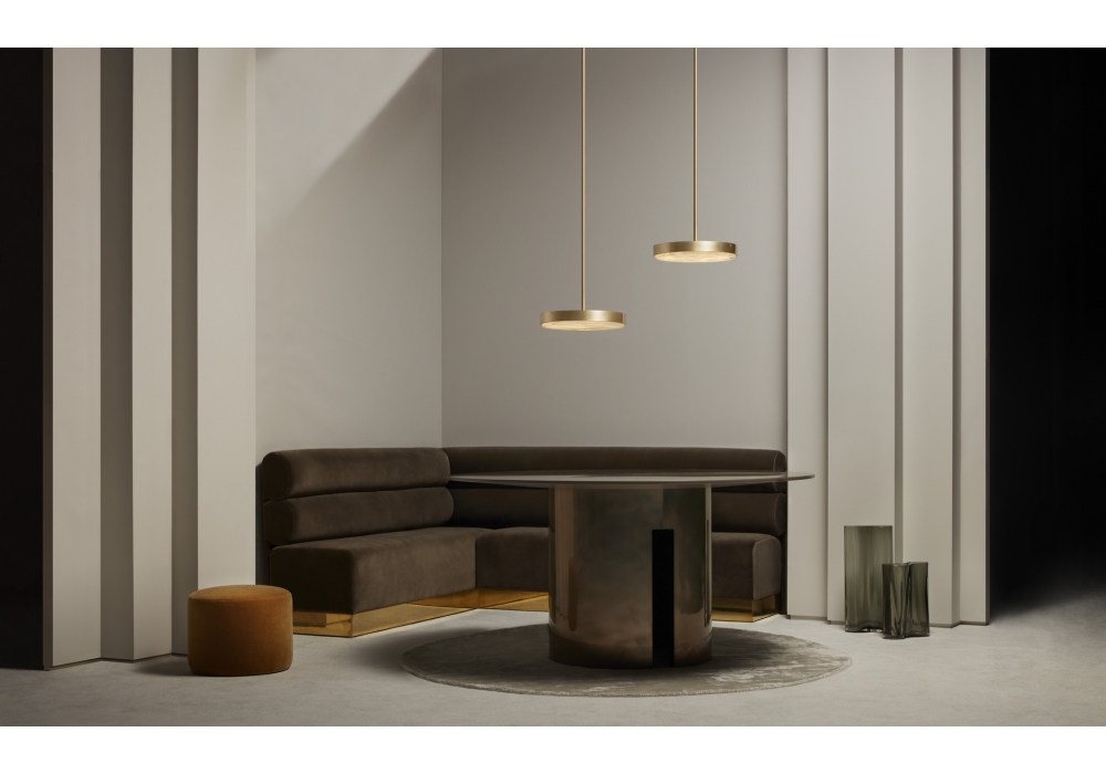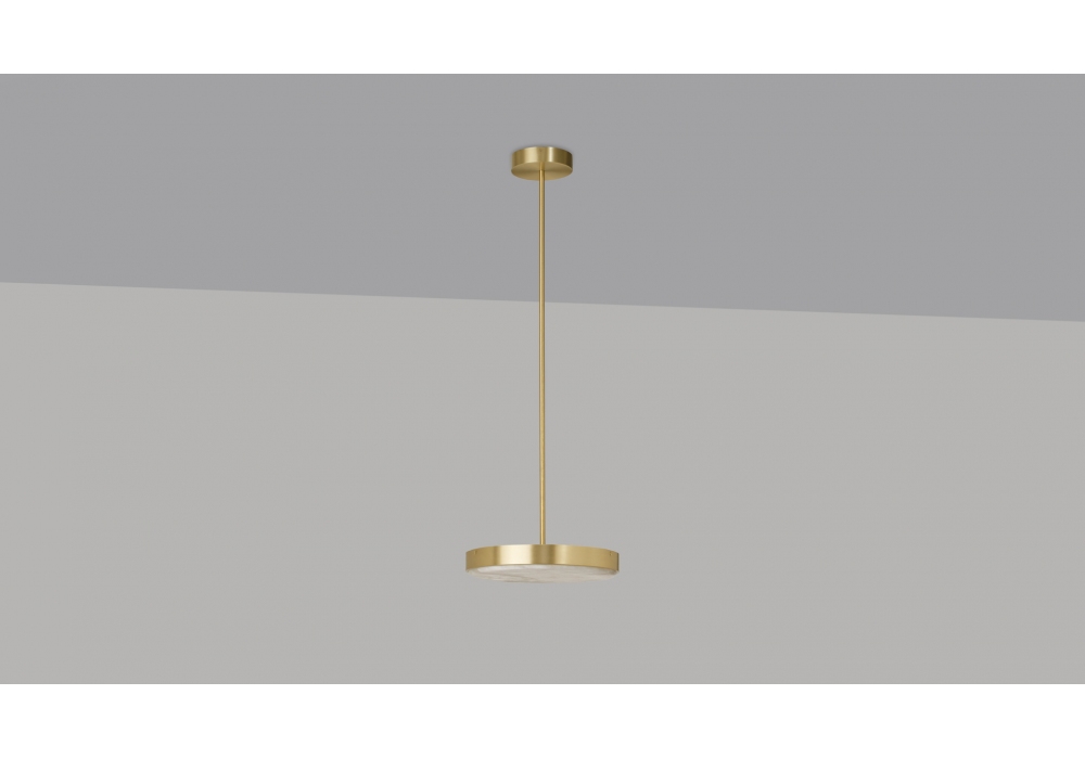 Anvers conçue par CTO Lighting est une suspension LED réalisée avec une structure en bronze satiné ou en laiton et un diffuseur en pierre d'albâtre polie. Disponible en 3 dimensions.