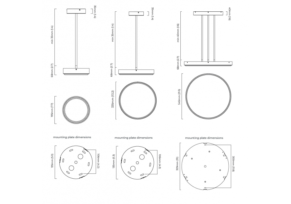 | Dimensions | Ø 19.5 cm - 10.5 W; Ø 33.5 cm - 16.4 W; Ø 54.5 cm - 24 W. |