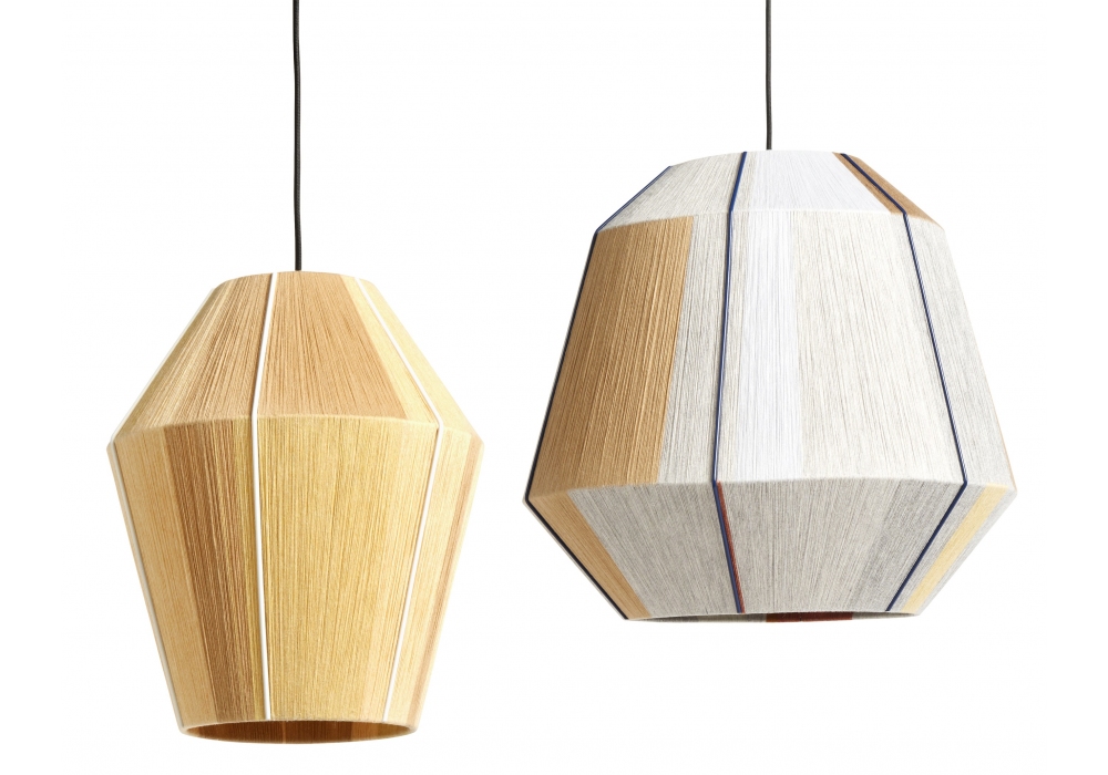 Bonbon conçu par Ana Kraš pour Hay est une suspension avec abat-jour externe tissé à la main en fil mélangé 80% laine et 20% nylon et cadre interne en acier enduit de poudre. Rosace de plafond en plastique ABS texturé et câble réglable en longueur en tissu tressé avec isolation en silicone. Disponible en différents modèles.
