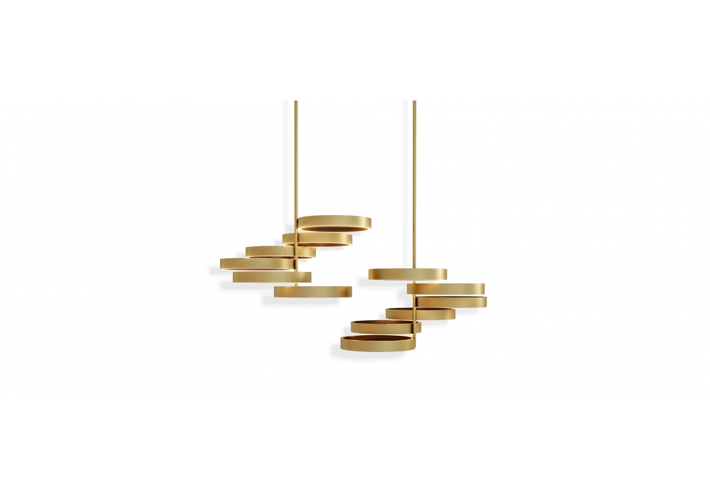 Helios conçue par Anna Tagliabue pour Emmemobili est une lampe à suspension, caractérisée par des cercles lumineux, en laiton et recouverte à l'intérieur de bandes en essence de bois. Les cercles, qui se développent le long d'une structure tubulaire, également en laiton, sont éclairés par des rubans LED de nouvelle génération. Version dimmable disponible sur demande et avec supplément.