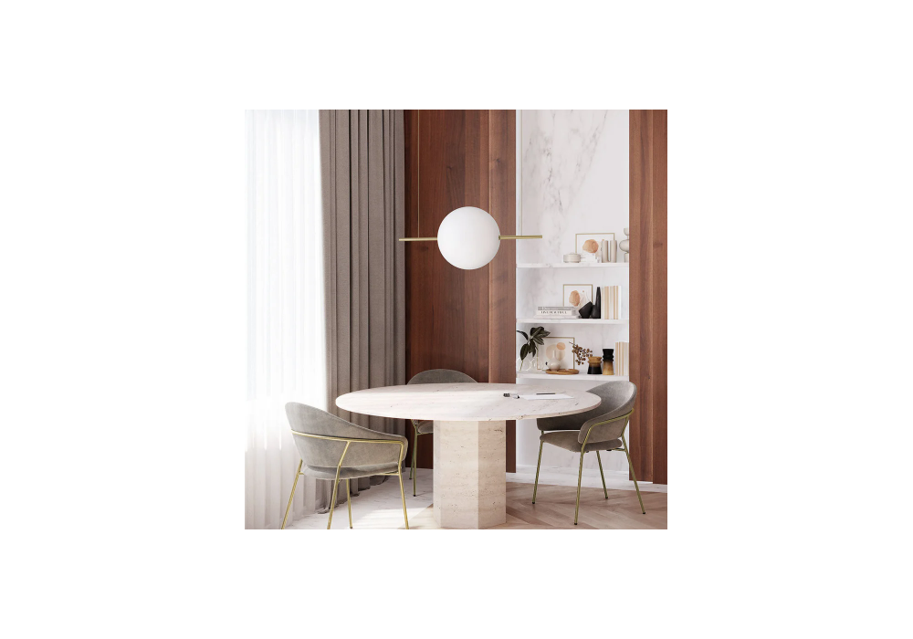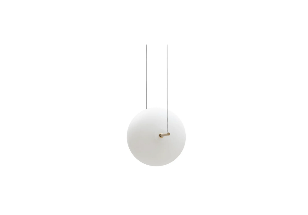 Alma conçue par Matteo Cibic Studio pour Il Fanale est une lampe à suspension avec structure tubulaire horizontale en laiton. Le diffuseur est de forme sphérique et fabriqué en verre opale et protège une source de lumière LED à intensité variable.