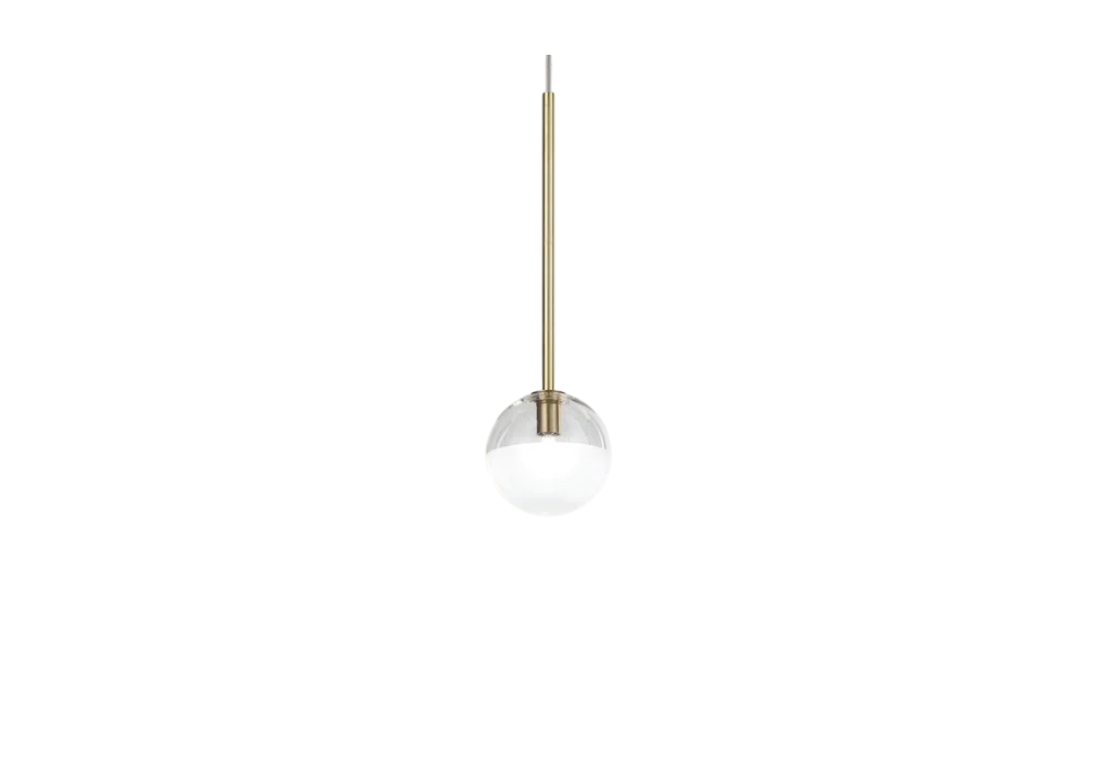 Molecola Single conçue par Fabrizio Fava pour Il Fanale est une lampe à suspension avec rosace et structure porteuse en laiton tubulaire. Le diffuseur est de forme sphérique et protège une source de lumière LED à intensité variable.